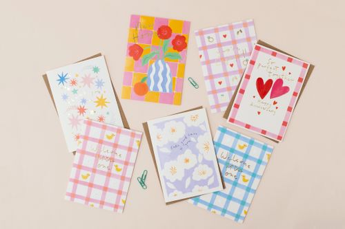 Covering everything from new home to thank you, occasions range Mochi will look great on shelves. Signature gingham checks, simple florals and hand-drawn icons give these designs a sweet charm.