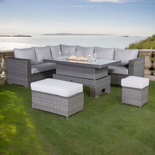 The Catalina Modular Range Corner Sofa Set combines a dark gray synthetic rattan frame with light gray comfortable cushions for a clean, textured look. Its central glass-top fire pit table provides wa ...