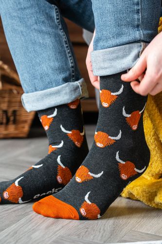 Crafted from naturally breathable bamboo these black dress socks feature Scottish highland cows. These beautiful socks are eco-conscious and feel luxuriously soft. Finished with a classic striped cuff ...