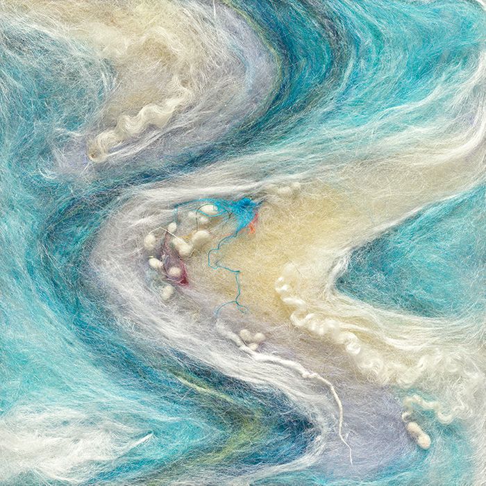 Hebridean Sea needle felt depicting an aerial view of the coastal waters. Swirling foam, seaweed, rope and ripple wave movement.