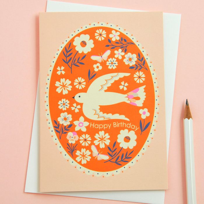 Pretty Happy Birthday floral & bird border greetings card in coral and tangerine.